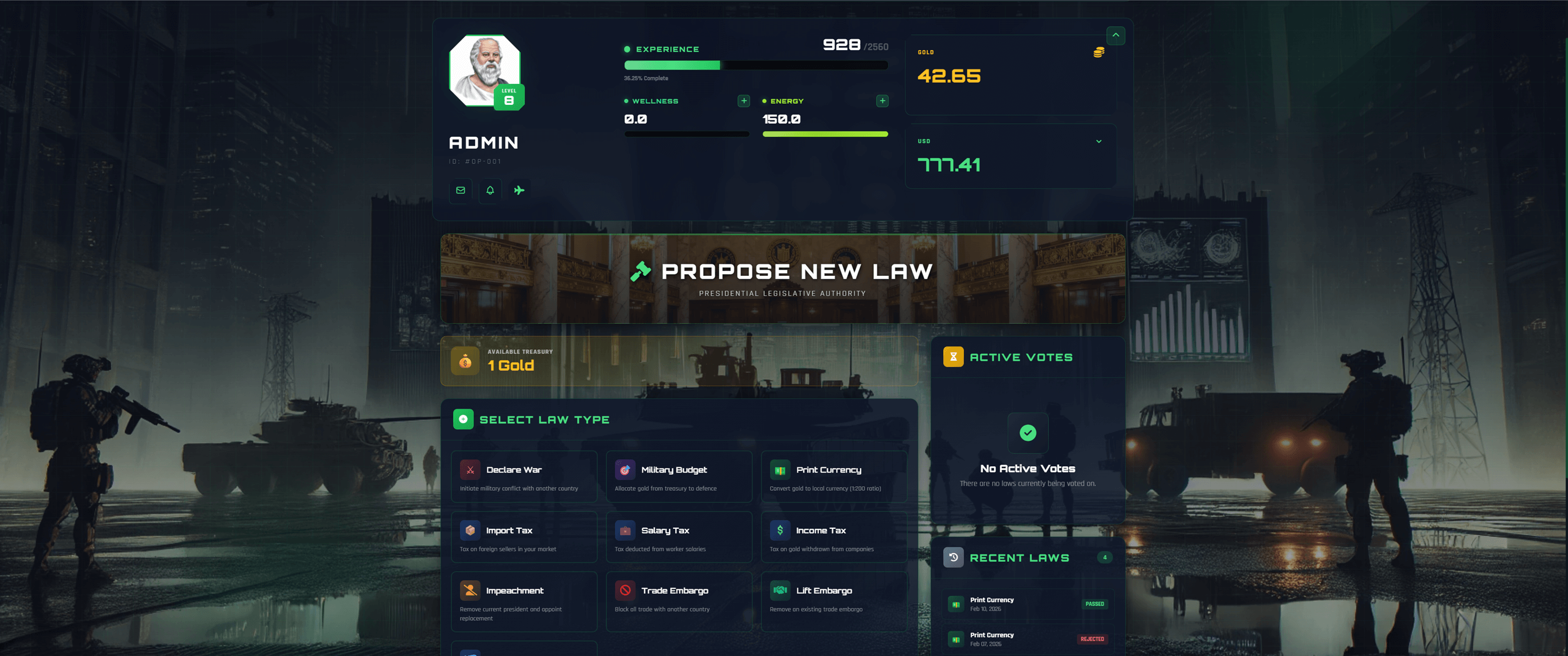 Join a nation, shape its economy, and wage war for dominance. No downloads required — play instantly in your browser. Click HERE to play Tactizen.