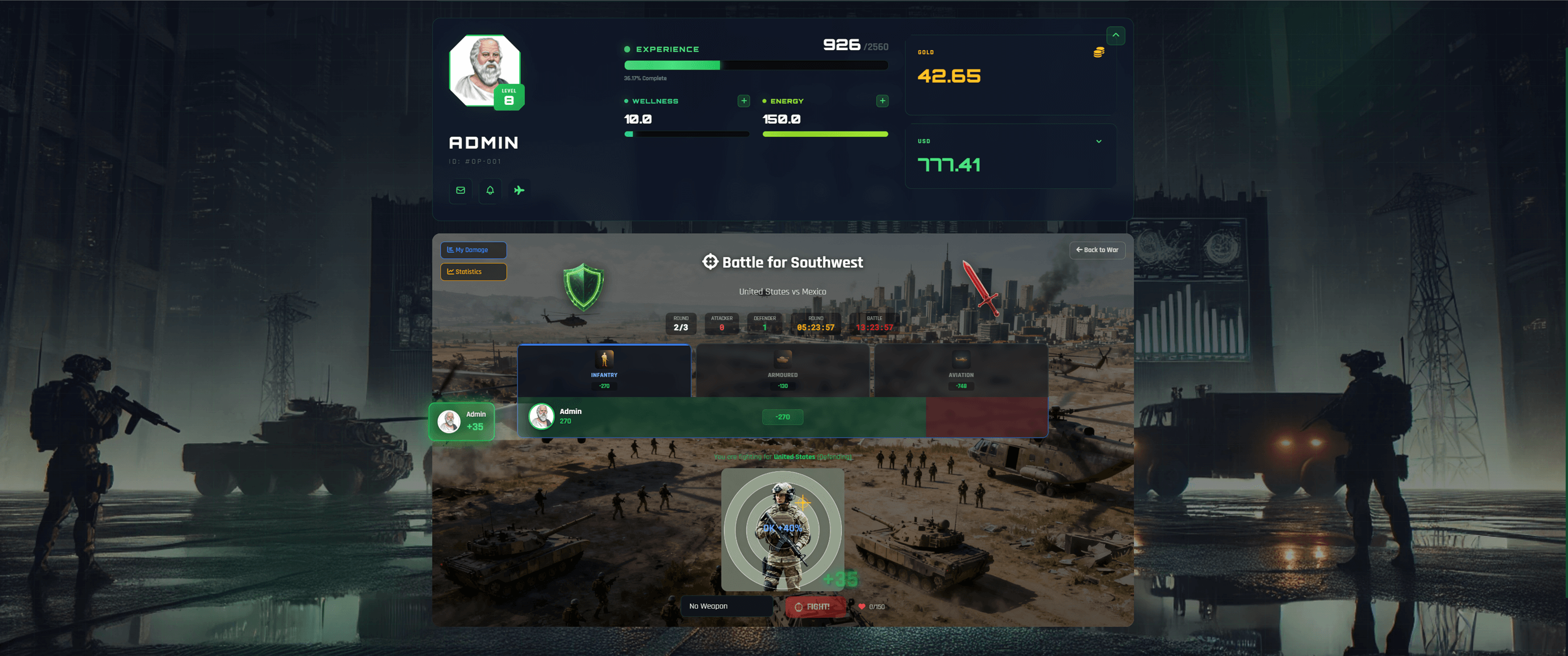 Train military skills, equip weapons, and fight in real-time battles across contested regions.
